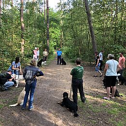 Eine Gruppe von Mensch-Hunde-Teams geht gemeinsam spazieren. Die Hunde bleiben an der Leine und interagieren nicht direkt miteinander. Kurze Übungseinheiten werden eingebaut.